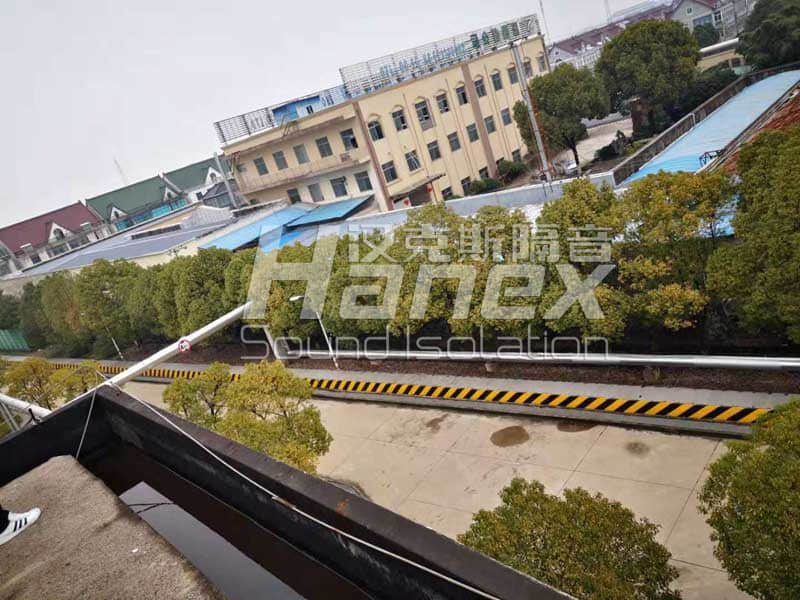 (1)經我方技術人員現(xiàn)場勘測及討論,建議制作隔聲罩用于控制噪聲,隔聲罩尺寸為1150mm*6800mm*2100mm。隔聲罩墻體及頂面采用單層隔聲結構,隔聲墻厚度100mm。為方便拆卸,隔聲墻板采用復合模塊組裝的方式,模塊構造為2mm鍍鋅鋼板+2mm阻尼膠+容重48kg/m3多孔吸聲纖維棉+玻璃絲布包裹+內置1.5mm折板骨架+1mm鍍鋅孔板組成,模塊外表面板噴塑處理;復合板塊所用原材料均為A級不燃及難燃材料制作,整體模塊的防火性能為不燃。設計隔聲量≥20dB(A)。隔聲罩頂面管道穿出處采用現(xiàn)場開孔,同時做好密封處理,避免噪聲漏出。