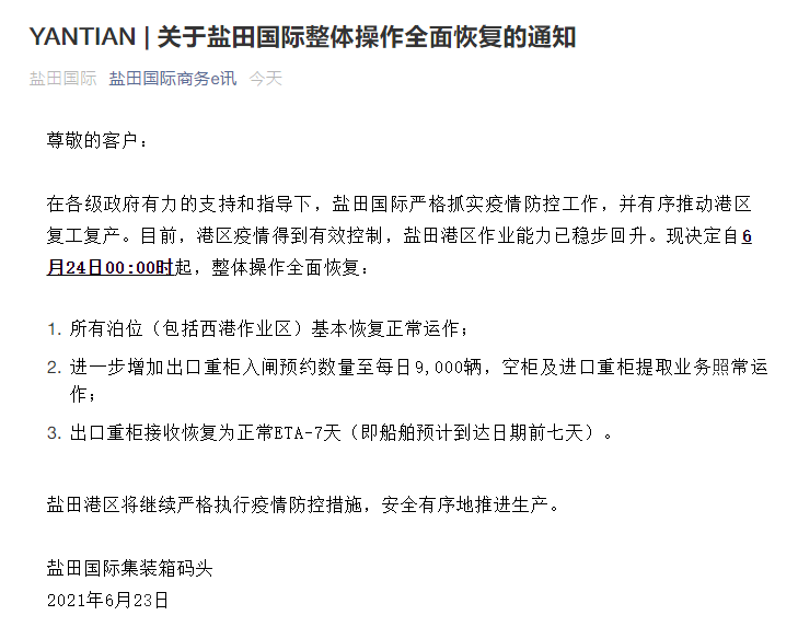 1.鹽田國(guó)際整體操作6月24日全面恢復(fù)