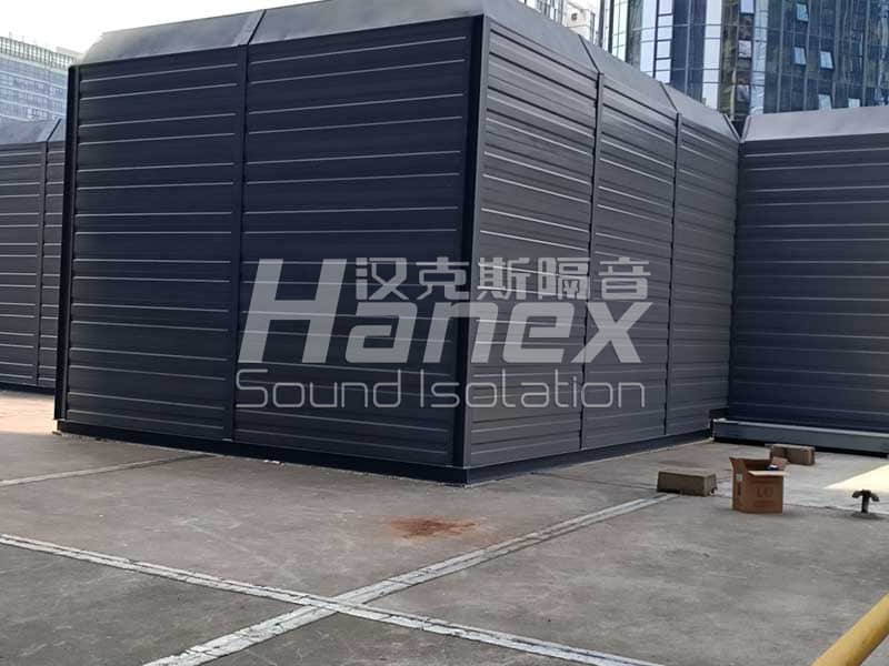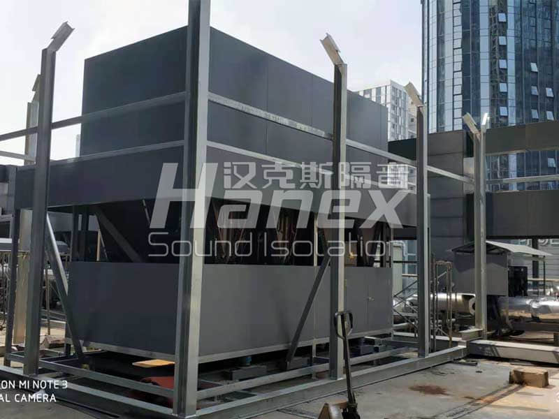 4、現(xiàn)場(chǎng)除了空調(diào)機(jī)組外,還有3臺(tái)水泵電機(jī)也需要做降噪措施。我司技術(shù)人員商討后決定在其部位安裝隔聲棚,隔聲棚采用鋼制復(fù)合吸隔聲板。為保證水泵電機(jī)的通風(fēng)散熱問題,隔聲棚東側(cè)及北側(cè)敞開。
