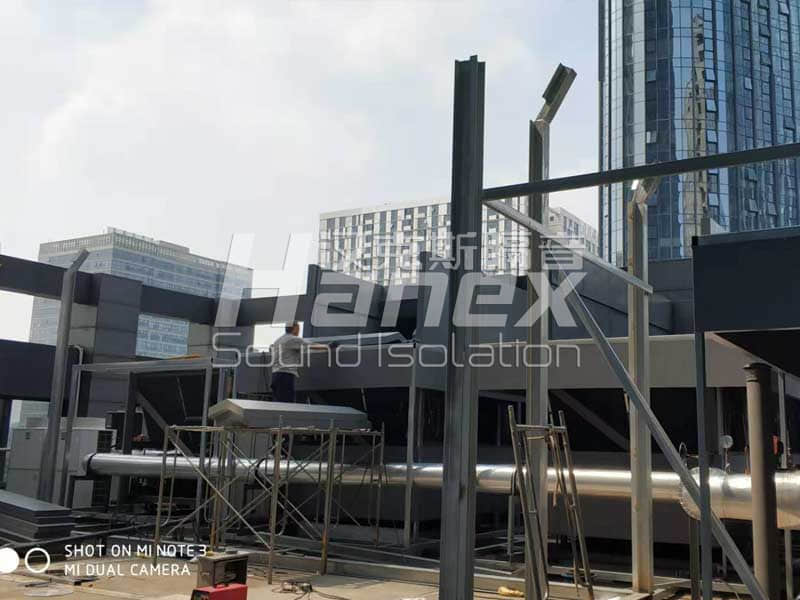 3、根據(jù)現(xiàn)場(chǎng)實(shí)際情況,空調(diào)機(jī)組底部的壓縮機(jī)周圍無阻擋,我司技術(shù)人員發(fā)現(xiàn)壓縮機(jī)工作運(yùn)行時(shí)所產(chǎn)生的噪聲往外擴(kuò)散,影響其周邊環(huán)境。因此,我司技術(shù)人員結(jié)合以往同類項(xiàng)目案例經(jīng)驗(yàn),采用隔音板對(duì)空調(diào)機(jī)組底部壓縮機(jī)四周進(jìn)行圍擋,控制其工作產(chǎn)生的噪聲往外擴(kuò)散。同時(shí)從空調(diào)機(jī)組頂部做500mm隔聲掛板,防止壓縮機(jī)產(chǎn)生的噪聲從頂部溢出擴(kuò)散到周圍環(huán)境。