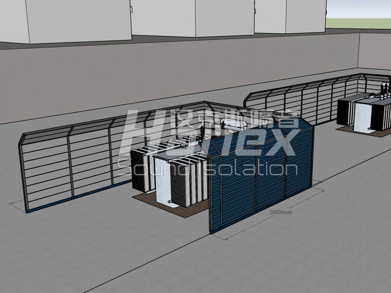根據(jù)現(xiàn)場噪聲源值大小、頻譜、噪聲源與附近居民樓位置關(guān)系、設(shè)備通風(fēng)散熱要求等因素,結(jié)合我們漢克斯隔音以往同類型項(xiàng)目分析,設(shè)計(jì)對該變電站采用2道U型屏障的方式進(jìn)行降噪處理。